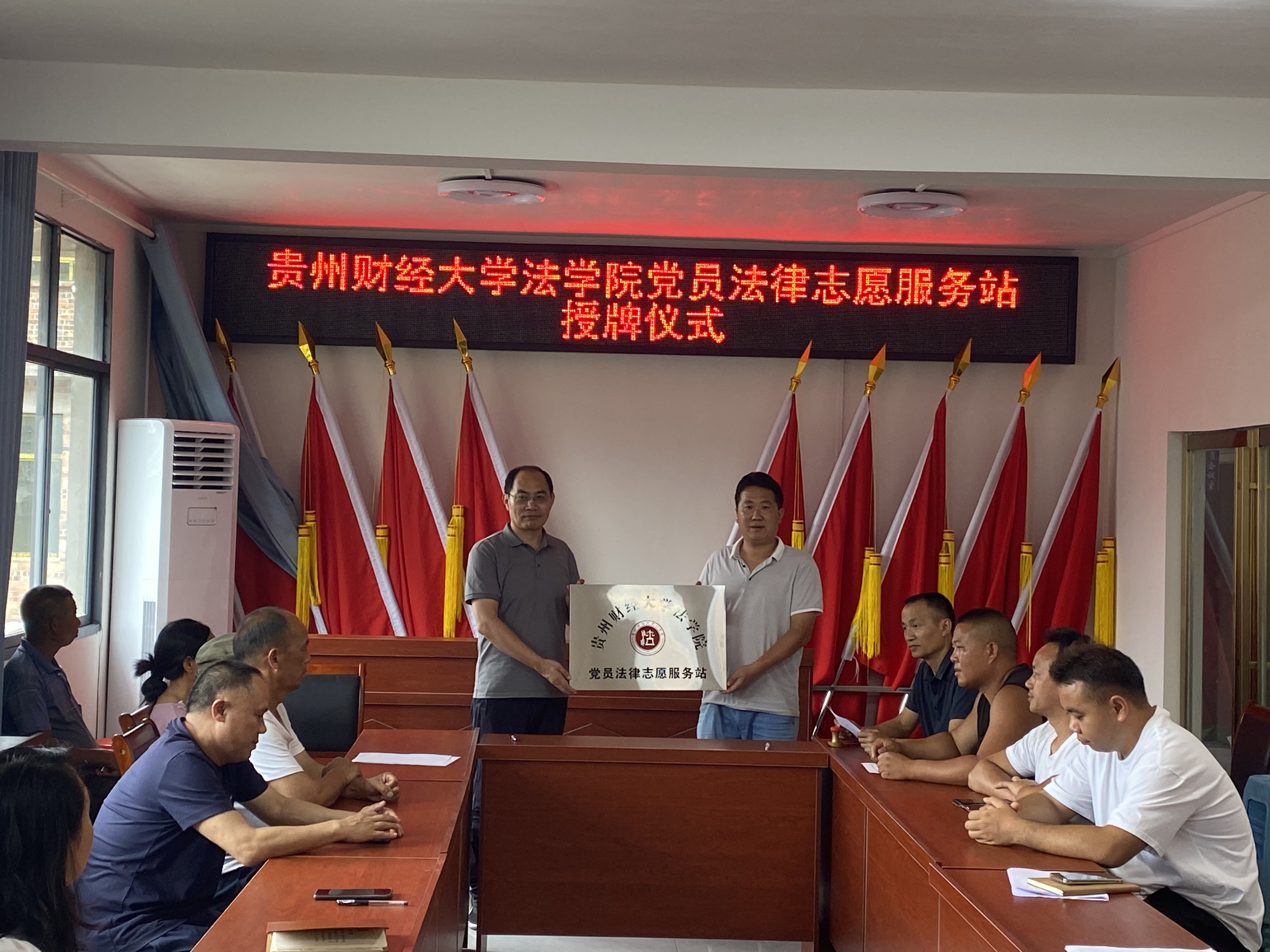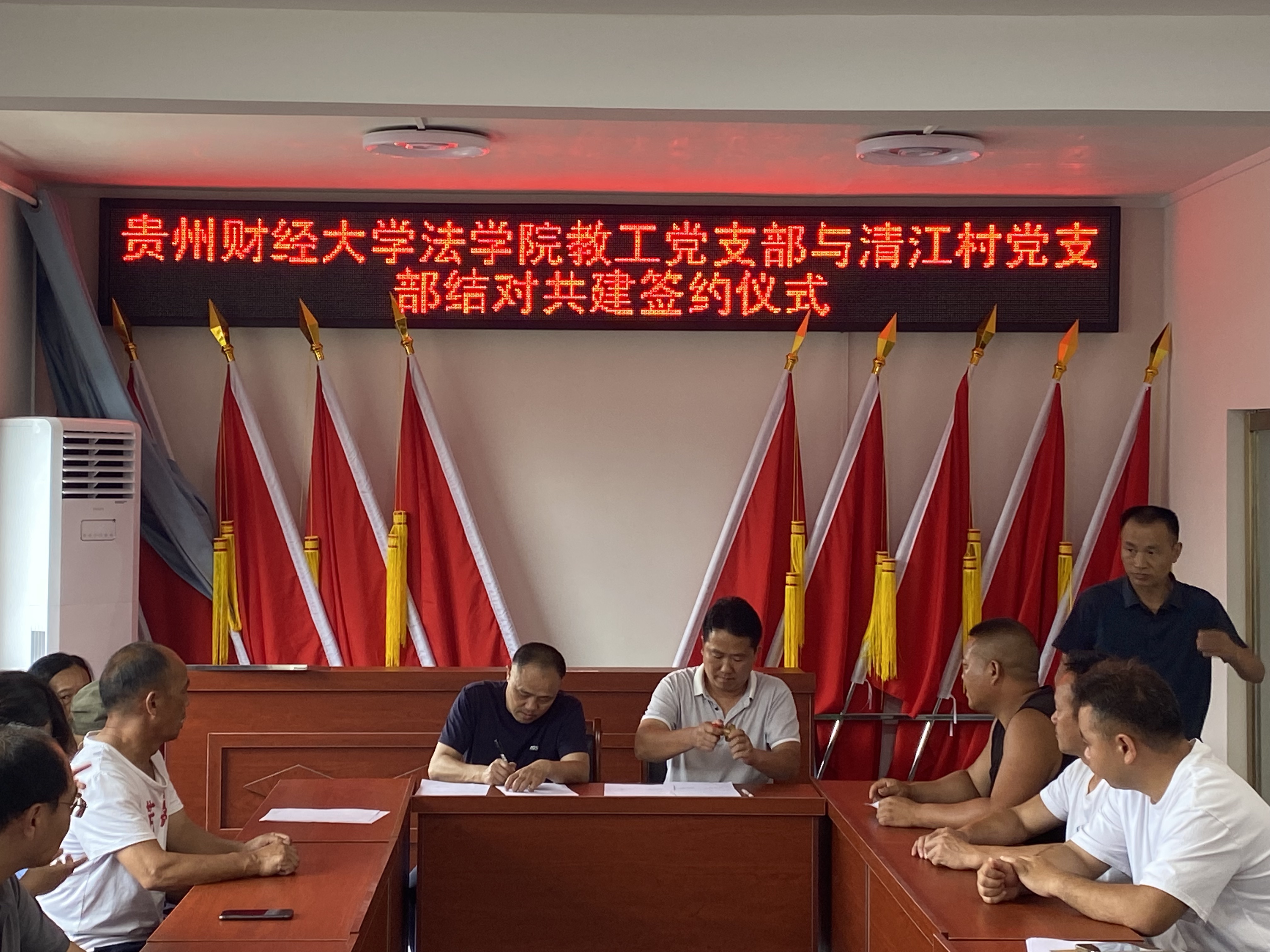 活动伊始,法学院党委与清江村村支两委、包括我院驻清江村第一书记李玉兰在内的驻村工作队开展座谈。清江村村支书陈世刚对法学院的到来表示欢迎,他介绍了清江村的村情民情等基本情况,希望法学院在民宿开发、苗族传统文化研学展销基地打造等方面给予支持。邵新顺表示将强化党建引领,与清江村党支部建立结对共建机制,发挥各自优势双向赋能,同时发挥法学院智力优势,为清江村的乡村振兴工作提供新思路、新方法。随后邵新顺与陈世刚共同为BANDAO.COM党员法律志愿服务站挂牌。曹务坤和陈世刚则围绕村民比较关心的婚姻家庭问题开展了题为《守护家庭权益 助力乡村振兴》的理论宣传二人讲,并现场回答了村民的相关困惑。曹务坤作为法学院教工第二党支部书记与陈世刚签署了党支部结对共建协议,两个支部将在支部建设、产业发展、法律援助与调解等方面开展合作。